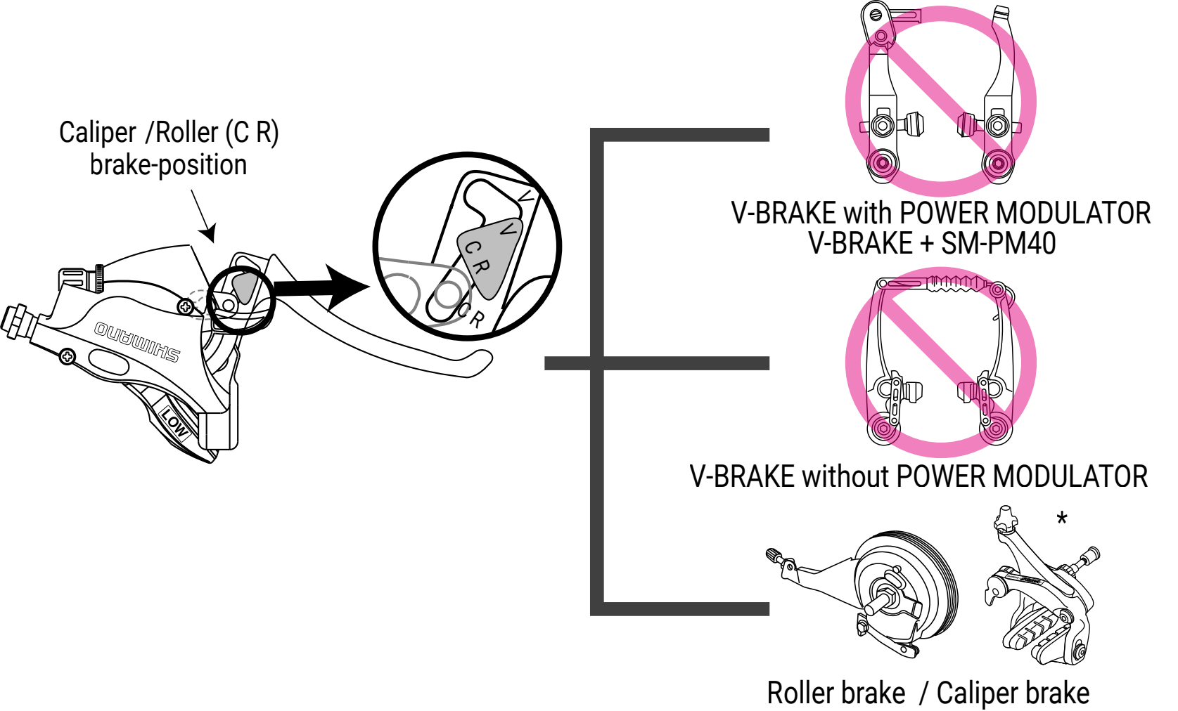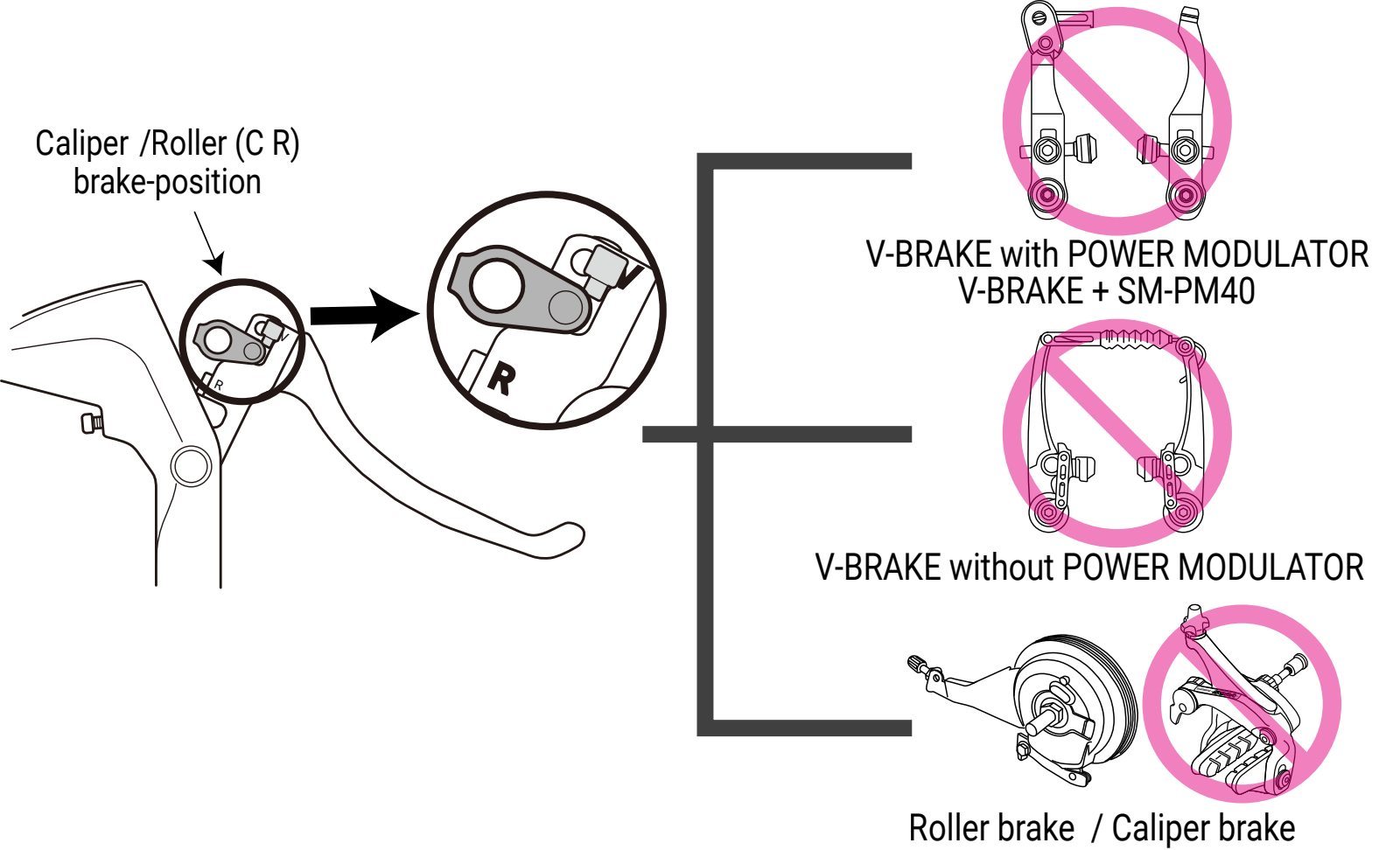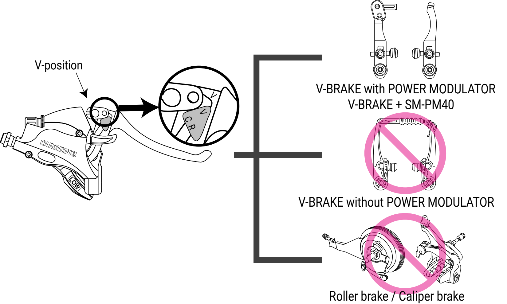 Four finger brake levers such as brake levers are equipped with a switch to change between the V-BRAKE with modulator mode (for example with SM-PM40) and the caliper brake or roller brake mode.